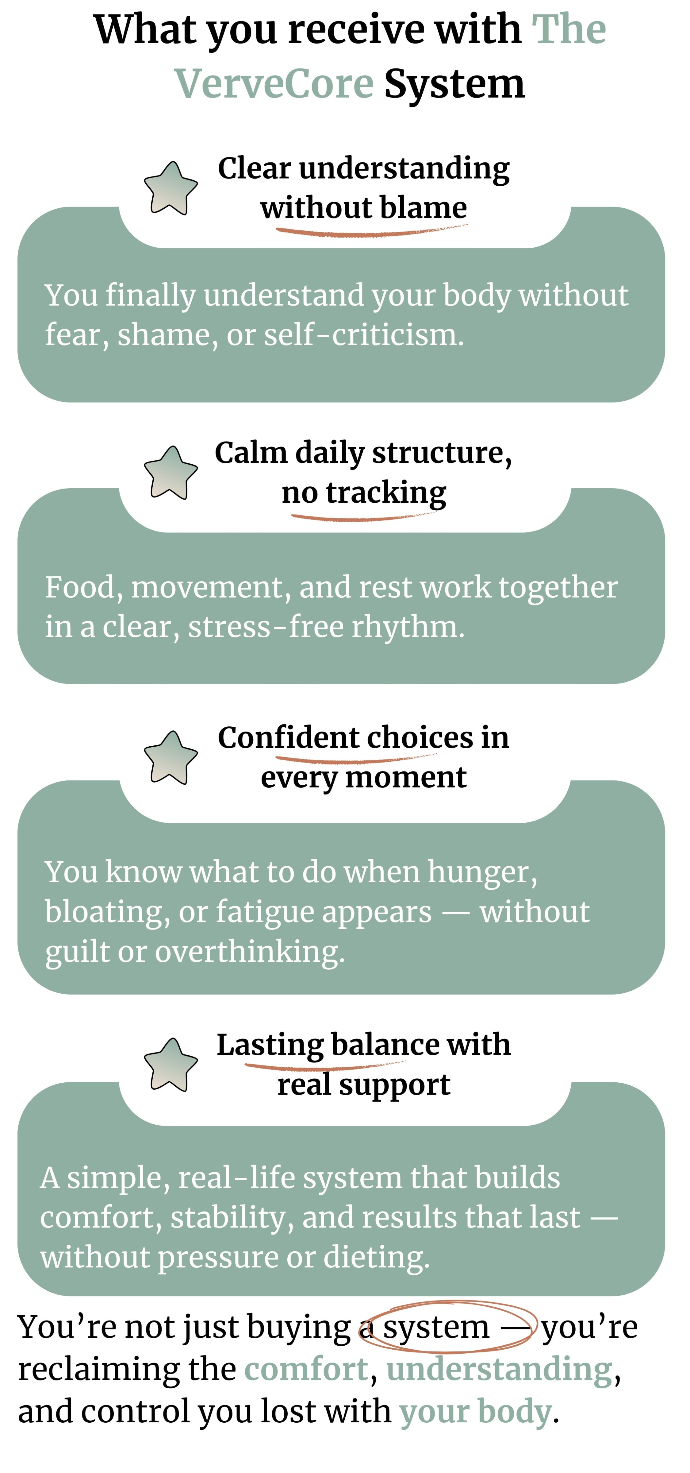 VerveCore isn’t a diet or challenge — it’s a simple system for body balance.